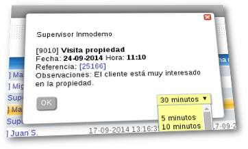 Hemos introducido una nueva funcionalidad en la agenda comercial que te permitirá mejorar aún más la organización de tu trabajo. Ahora podrás asociar a cada evento la generación de una alarma en pantalla y/o email, con los plazos de antelación que te interesen para cada evento. Podrás establecer alarmas para reuniones, visitas, citas, llamadas, etc. Para establecer un aviso (o alarma) para un determinado evento, śólo tienes que seleccionar el plazo en el campo "Aviso por email" y/o "Aviso por pantalla". Una vez que el aviso aparece en pantalla puedes darlo por finalizado pulsando el botón "OK" o retrasarlo indicando el nuevo plazo.