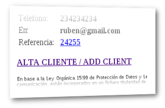Te facilitamos dar de alta como clientes a los contactos que recibes por email desde tu web. Simplemente haciendo click sobre el enlace "ALTA CLIENTE / ADD CLIENT" que aparece en la parte final de cada email, se cargarán los datos recibidos en la pantalla de alta de cliente. Si no estás conectado a Artekasa antes de pulsar sobre el enlace, aparecerá la pantalla de entrada, y tras introducir tu usuario y tu clave se mostrará la pantalla de alta de cliente. Esta función sólo facilita y agiliza la introducción de datos de clientes, para aprovechar al máximo la potencia del sistema, lo más adecuado es contactar con el/la cliente y recabar información detallada para registrar la correspondiente orden de compra o alquiler.