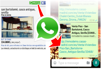 para enviar por WhatsApp. Esta opción sólo está disponible cuando se accede a la web desde teléfonos móviles, y genera el envío de un mensaje con la información resumida de la propiedad y un enlace a la página de detalle en la web.