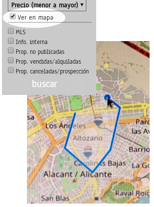 Accede a "Búsqueda de propiedades" (MENU: Propiedades > Búsqueda), introduce los filtros que te interesen, selecciona el botón "Ver en mapa" y pincha en "Buscar". Sobre el mapa que se muestra, dibuja con el ratón una zona cerrada a la que quieras restringir la búsqueda y pincha de nuevo en el botón "Buscar". Para desactivar la búsqueda en la zona dibujada, pincha en el botón "Borrar área mapa".