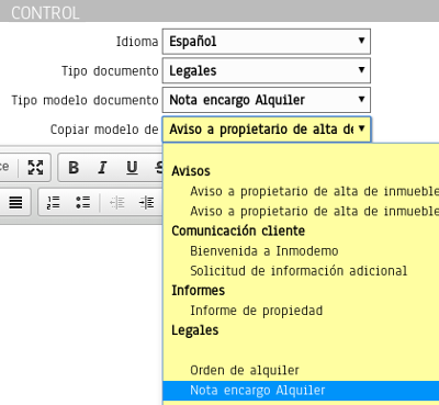 De esta forma, en vez de crear el modelo desde cero, podrás basarte en uno de los ya disponibles en el sistema y así evitarás reintroducir el contenido que quieras mantener. Para hacerlo, accede a la generación de modelos desde "MENU: Documentos > Modelos documento > Alta", y selecciona el modelo predefinido en el campo "Copiar modelo de".