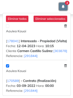 "Eliminar". Elimina varias notificaciones simultáneamente seleccionándolas y pulsando en "Eliminar seleccionadas", o todas ellas con el botón "Eliminar todas".