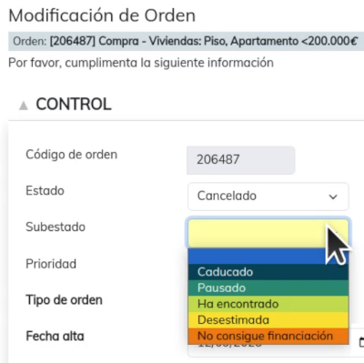Entra en la función de "Modificación" de orden y al seleccionar el estado "Cancelado" se visualizará el nuevo campo "Subestado", donde podrás indicar el motivo de la cancelación.