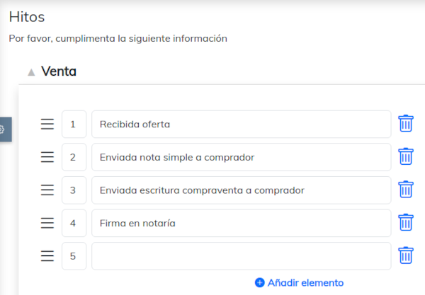 Configura tus propios hitos accediendo a "MENU: Propiedades > Operaciones > Hitos". Desde esta pantalla introduce las distintas tareas de las que deseas realizar seguimiento en cada operación. Puedes modificar el orden pinchando y arrastrando el icono ☰ (tres lineas horizontales) a la posición correspondiente.