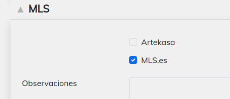 Si quieres compartir una propiedad en MLS.es, basta con que marques el campo "MLS.es" en la sección "MLS" del formulario de alta/modificación de propiedad. Introduce en el campo "Observaciones" de esta seción los comentarios que quieras compartir con otros asociados.